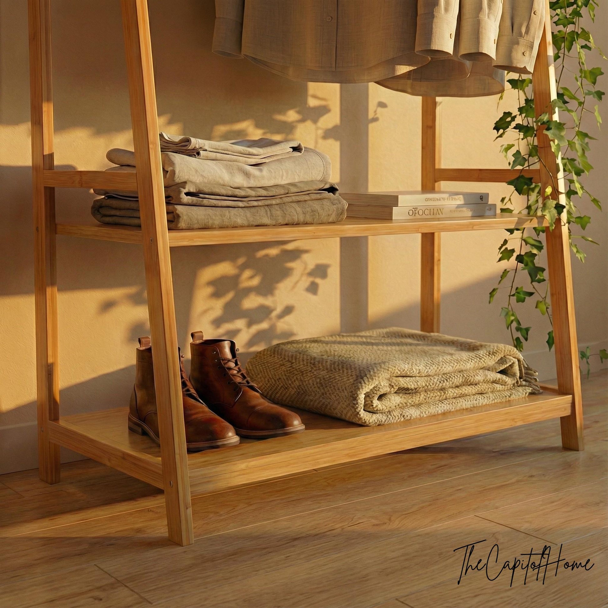 Elevate your bedroom or dressing area with this Japandi-inspired bamboo A-frame clothes rack. Combining a sturdy A-frame structure with open shelves and hooks, this freestanding garment rack keeps your outfits organized and beautifully displayed. No wall mounting needed – just set it up and enjoy instant wardrobe organization.